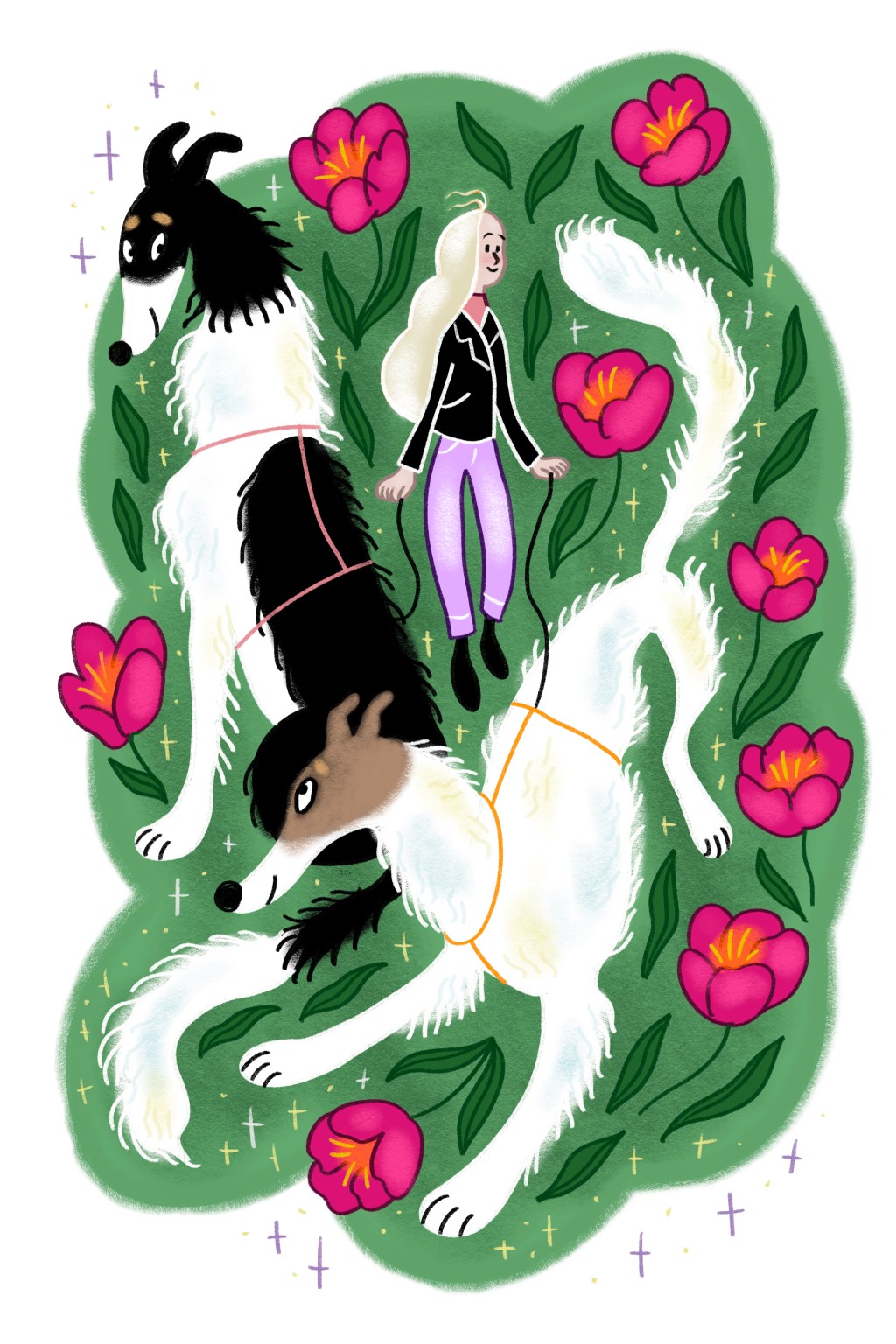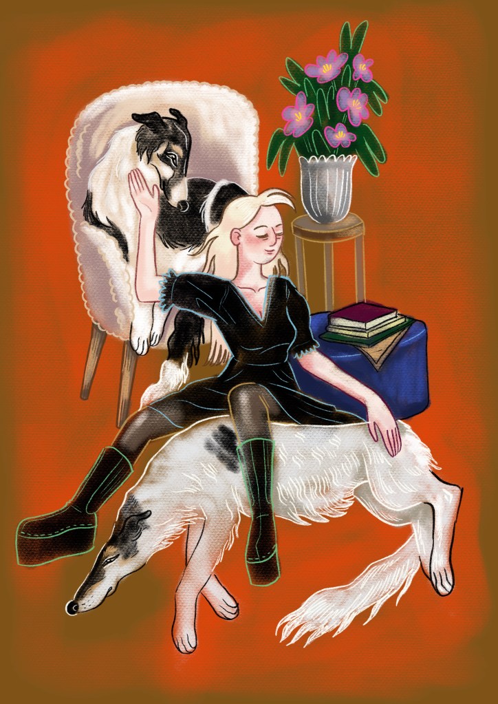 Illustration for Finnish Borzoi Club’s magazine starting from 2024. I write a column for the breed club’s magazine, inspired from my graphic novels dog lady character. I’m delighted I can be “double-creative” and make an illustration to accompany my column.