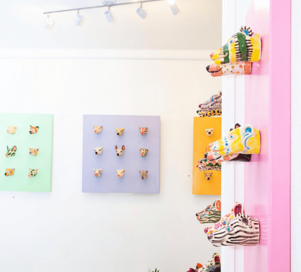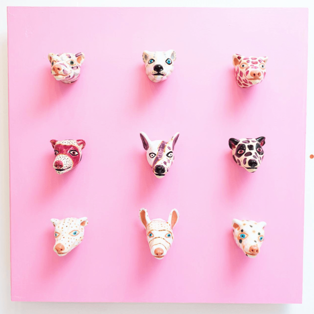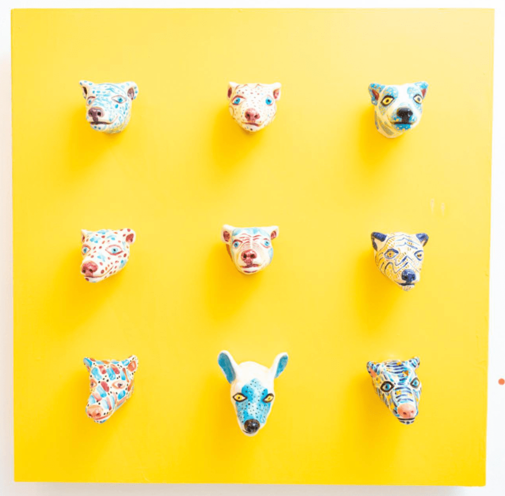 Clay Kennel was an art exhibition of colorful ceramic dog heads, displayed at Tila 42 gallery in Töölö, Helsinki, in October 2019. Inspired by 19th-century drinking cups, the wall-mounted dog figures invited viewers to pause and reflect with their playful, watchful presence. The installation combined sculpture, pattern, and design—drawing from my background in graphic design and illustration.