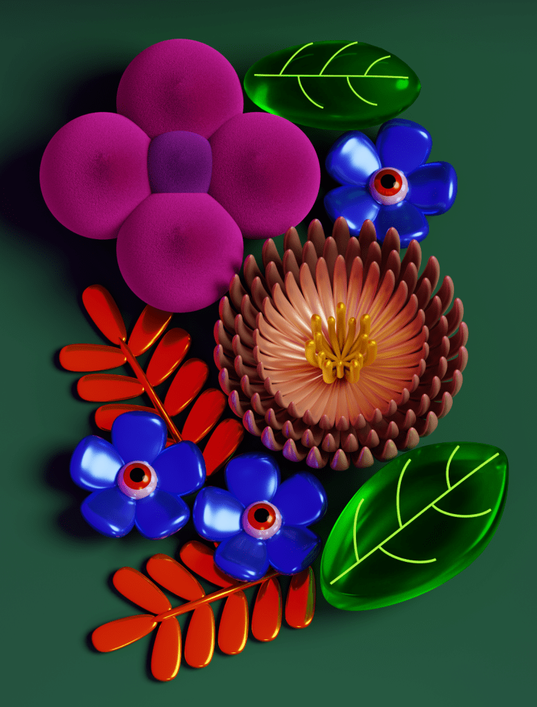Kreatures – Imaginary flora & fauna inspired from the nearby nature is an exhibition of 20 illustrated digital prints combining 3D illustration, 3D-printed details, and poems. The works are aimed especially at families with children.